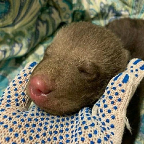 Зоологи говорят, что медвежонку примерно 2 недели, он еще не открыл глаза и легко умещается в ладони.