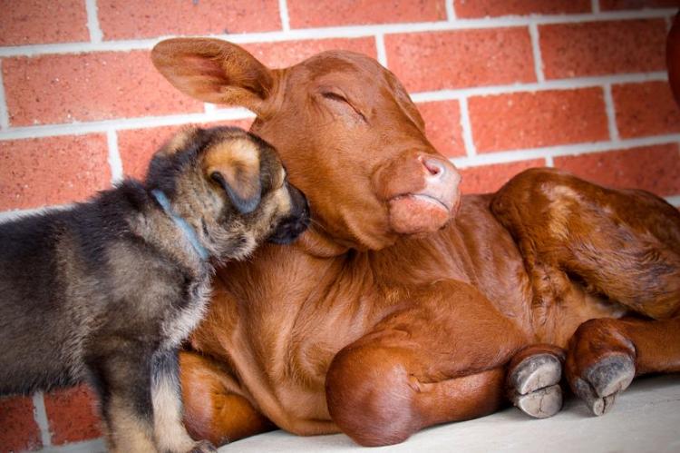 Наверняка кто-то сталкивался с похожей ситуацией, поэтому нужно мнение опытных людей. Не так уж редки ситуации, когда одно животное выхаживает сиротку другого вида, это понятно. А что потом делать? Вот Бадди — 6-недельный бычок, который в итоге будет весить полтонны, но при этом искренне считает себя щенком!