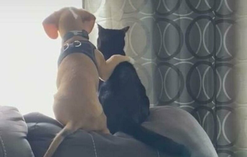 «Бо запрыгнул на диван и сел рядом с Джаспером. Затем он обнял кота и животные некоторое время наблюдали за птицами на заднем дворе», — написал автор видеоролика.