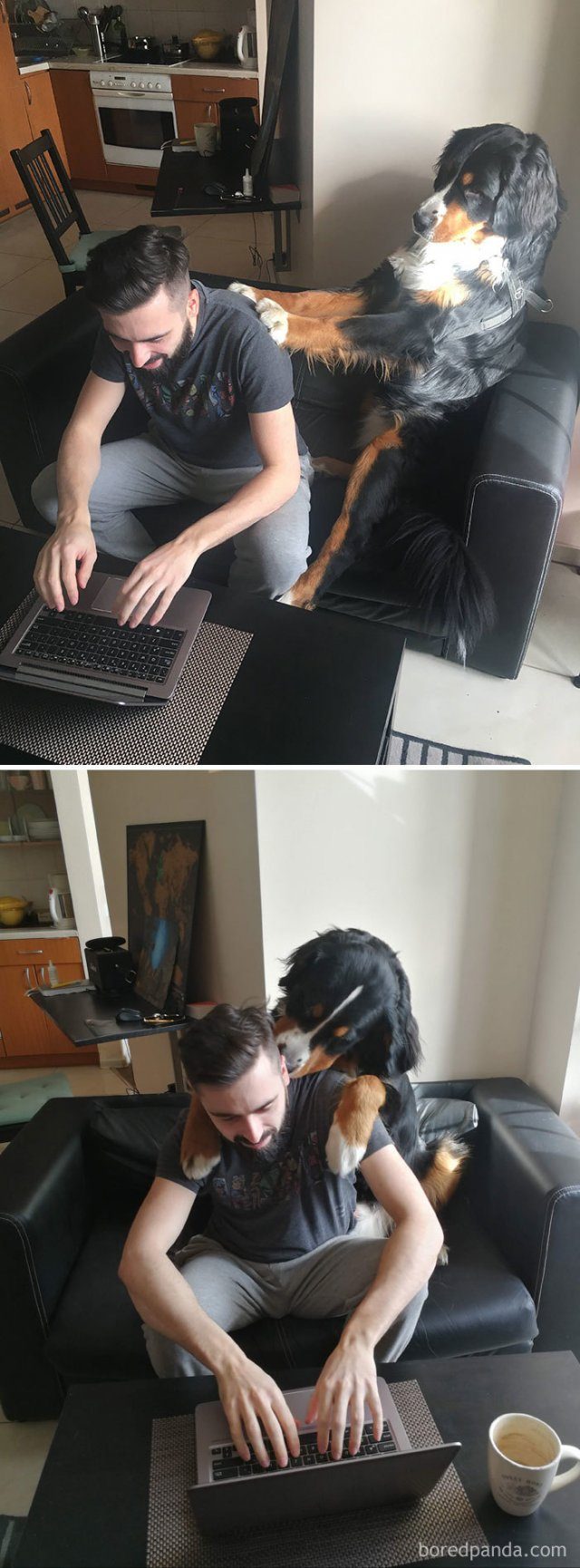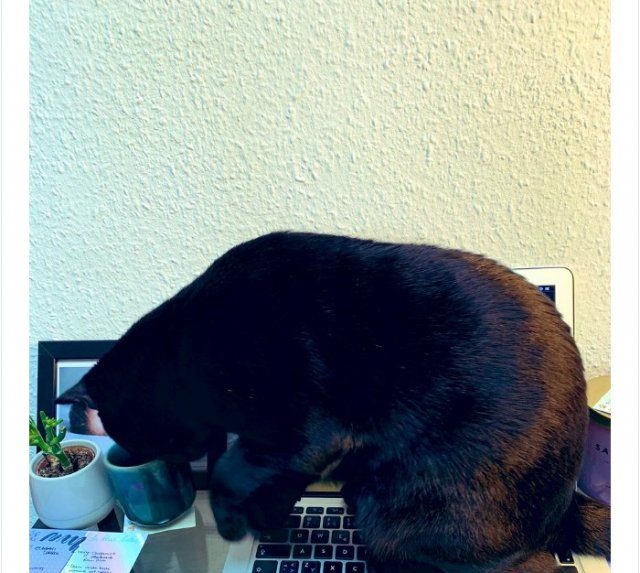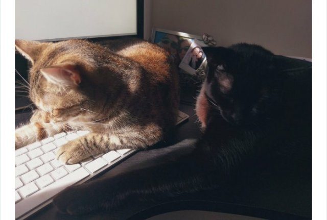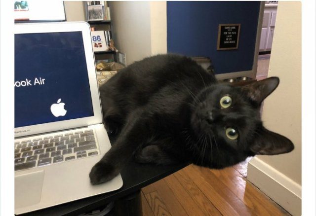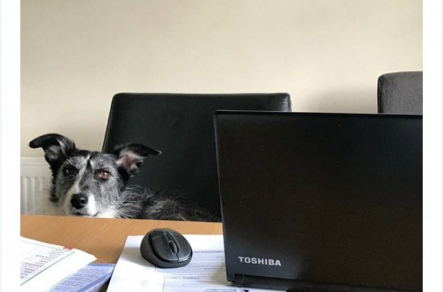 Владельцы кошек и собак публикуют фотографии своих новых «коллег», которые не оставляют их в одиночестве, всячески стараясь обратить на себя внимание, мешая работать и ложась где-то между клавиатурой и монитором, но так, что печатать совершенно невозможно.