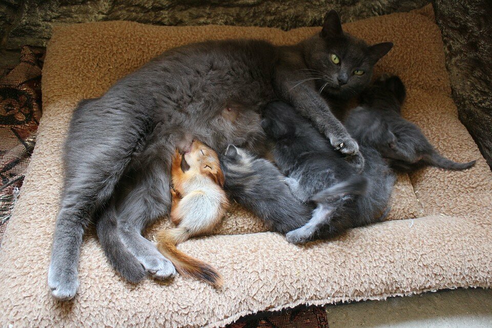 Бельчат отнесли в местный зоосад, который находился при парке. Правда, что делать с пищащими малышами там не знали. Но здесь один из сотрудников вспомнил, что у них недавно окотилась кошка. Решили попробовать дать ей крох на воспитание.