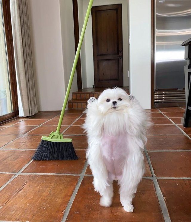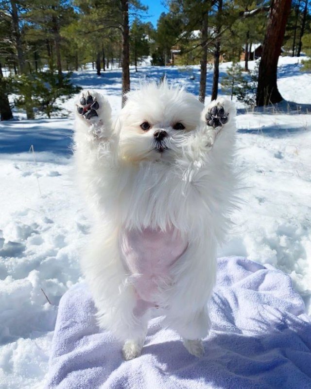 Эту очаровательную мальтийскую болонку по кличке Коко (Coco) однажды научили этому трюку, и теперь она постоянно поднимает лапки в приветственном жесте. По словам хозяев, теперь она делает это там, где хочет, и тогда, когда хочет.