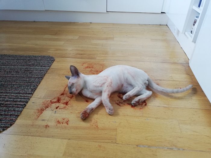 Но, присмотревшись, он понял — это пушистый вредитель стащил из шкафа пахучую паприку и извалялся в ней до беспамятства!