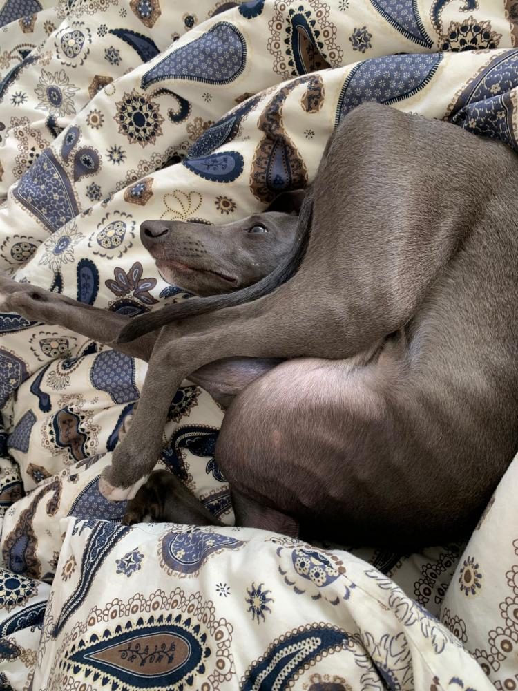 Семья бросилась спасать собачку, но та в мгновение ока раскрутилась и начала бегать вокруг, виляя хвостом. И что это было? Как оказалось, понятие «гибкости» у щенка борзой не имеет ограничений. Приветствуя хозяев поутру, Поуси из всех сил выражает радость, начинает крутиться, метаться и в прямом смысле закручивается в такие узлы, что йоги завистливо вздыхают. Но ей и этого мало, энергия у щенка бьет через край, поэтому картина начинает принимать сюрреалистичные детали. Поуси не очень понимает, что творит — для нее это просто выражение радости.