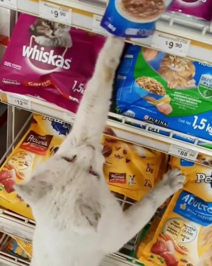 Через несколько секунд кот подводит ее к полкам с кошачьей едой и указывает на корм того бренда, который ему нравится больше остальных.