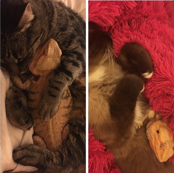 Ящерице нравится спасть с котами — они мягкие и теплые