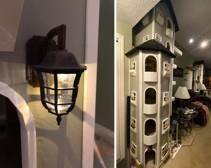 Так жилище американца превратилось в город для кошек. Аккуратные и оригинальные домики – совсем как настоящие. Они подсвечиваются в темноте, фонарики у входа тоже светятся, на подоконниках и на крыльце – цветы (конечно, искусственные).