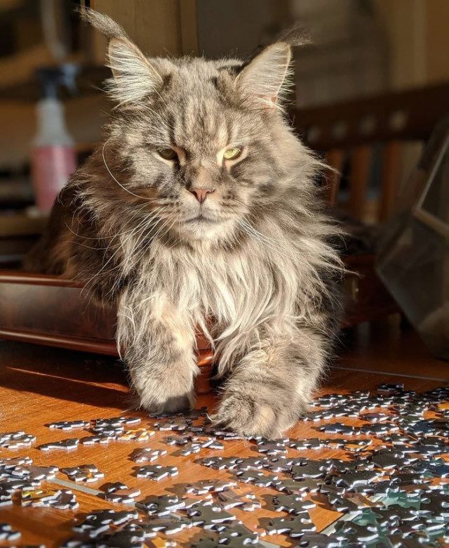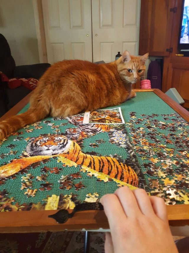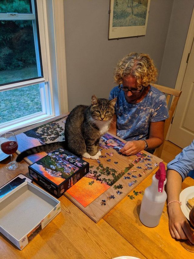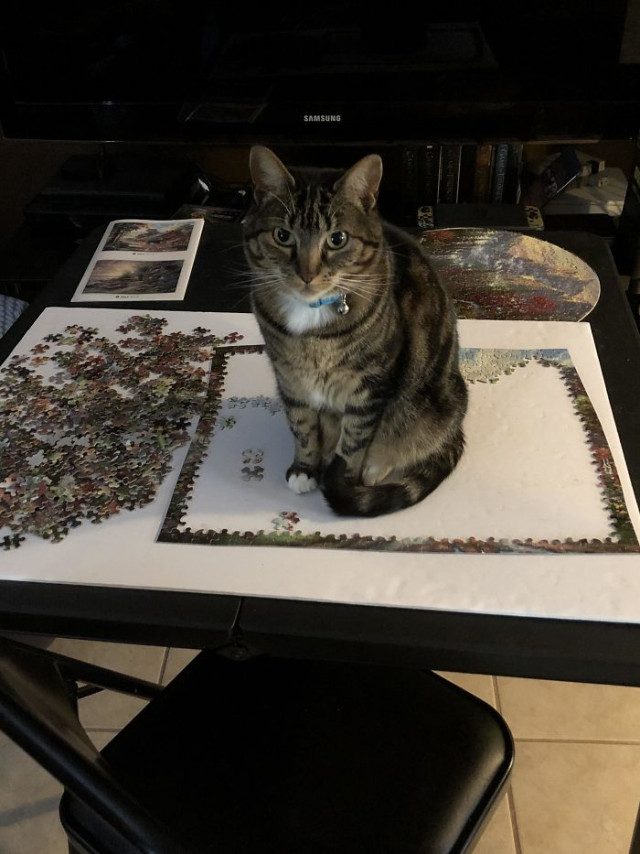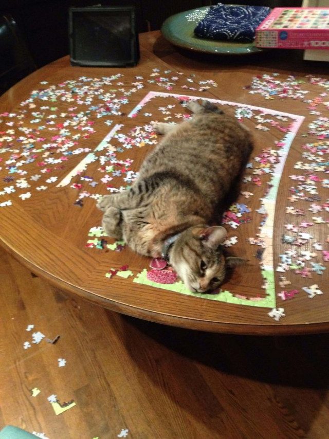 Как известно, кошки всегда любят наблюдать за тем, что делает его человек. А ещё они любят быть в центре внимания. Когда эти два желания совпадают, они с ленивым удовольствием могут разлечься прямо посреди картинки-пазла, которую собирает их владелец.