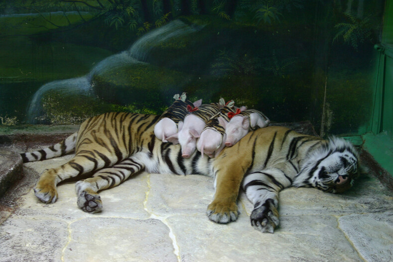 Эта история случилась в Таиланде более 10 лет назад. В одном из зоопарков маленького тигренка вскормила свинья, поэтому когда он подрос, то стал дружелюбно относится ко всем хрюшкам. К Сай Май в вольер подсадили поросят, и они вместе мило сожительствовали. Многие посещали этот зоопарк только для того, чтобы посмотреть на эту необычную дружбу.