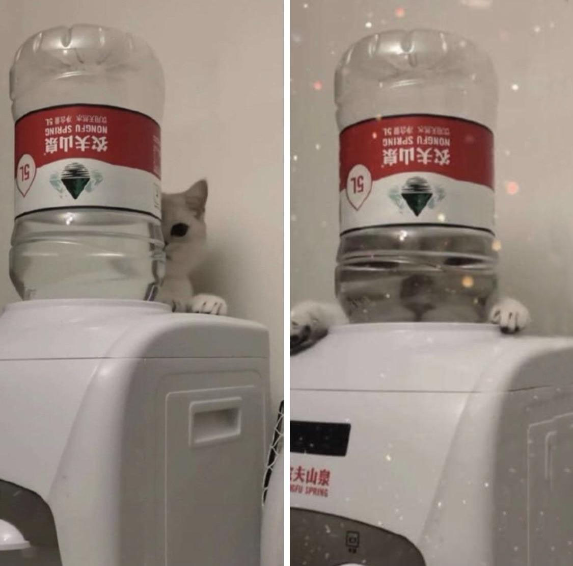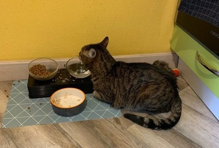 В прозрачной миске трудно заметить уровень воды, поэтому кот наловчился пить по-тигриному – лежа
