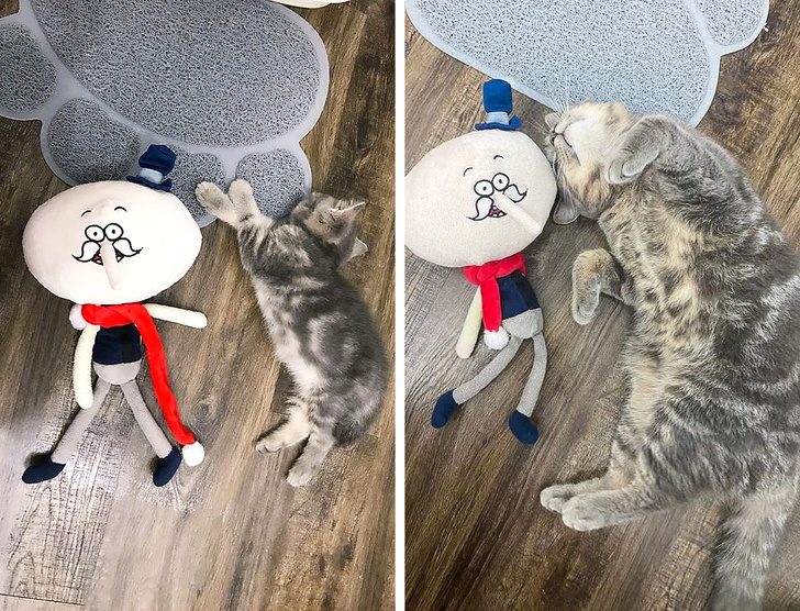 Эллиот со своей любимой игрушкой: 4 недели vs. зрелый возраст