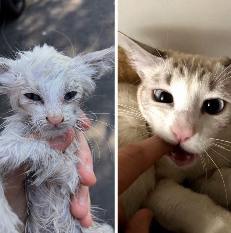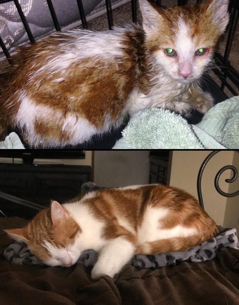 Разница между снимками всего неделя, но она хорошо показывает, как поменялась кошка, которая обрела новый дом