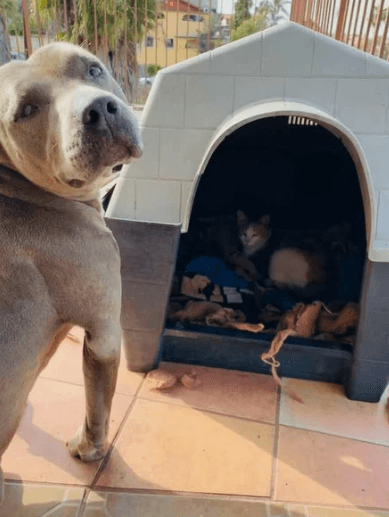 Поразительно, но грозный пес уступил кошке свой дом да еще и притащил из дома свою любимую подстилку. В общем, устроил все, чтобы кошка могла с комфортом разрешиться от бремени.