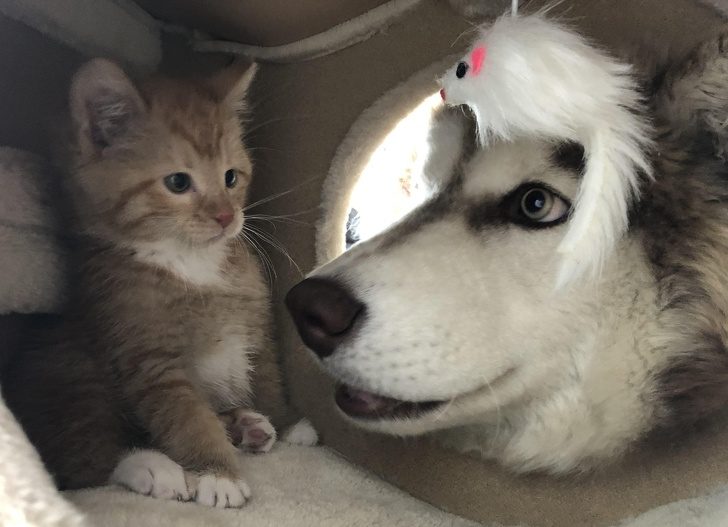 1. «Никогда не видел своего хаски таким счастливым, чем когда он пришел поздороваться с нашим котенком»