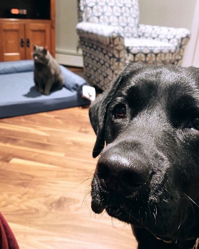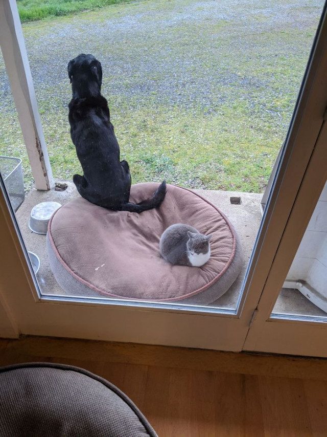 У собак такие большие лежанки и они такие добрые, что им не жалко поделиться местом со своими мурлыкающими домочадцами. А эти пушистые наглые морды не любят тесниться, поэтому, как правило, занимают их сами. Полностью. Даже несмотря на то, что сами размером с мячик.