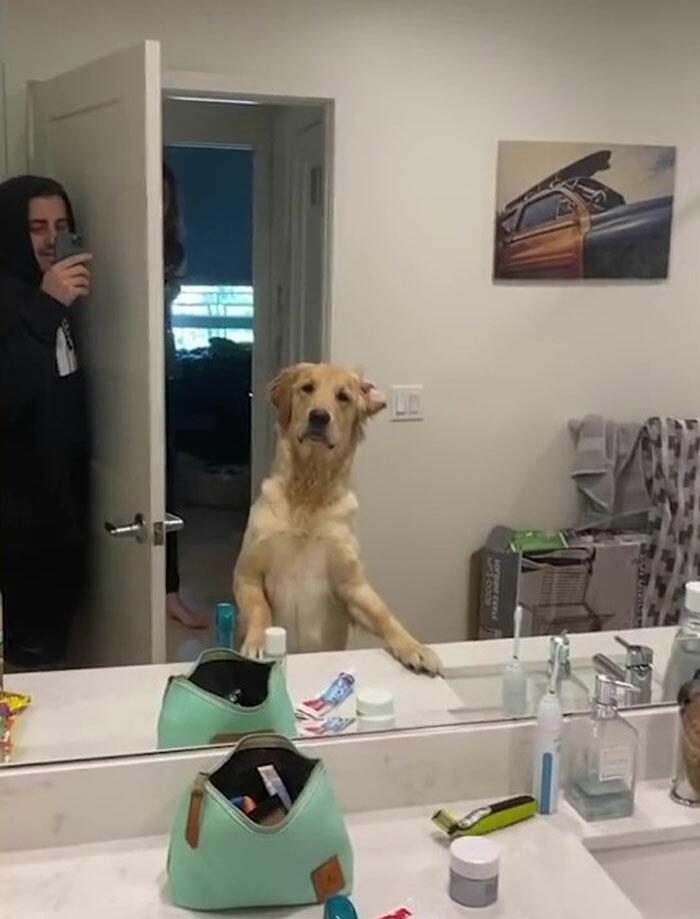До сих пор неизвестно, на самом ли деле собаки понимают, как работают зеркала, потому что в привычной жизни они привыкли больше доверять своему носу, чем глазам. Тем не менее принято считать, что собаки осознают, кто они есть, что у них есть тело и даже своё имущество, т.е. предметы, которые, как они считают, принадлежат им.