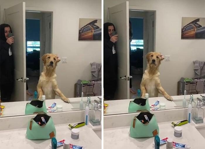Собака, которая пытается понять, как работают зеркала, чтобы найти хозяина