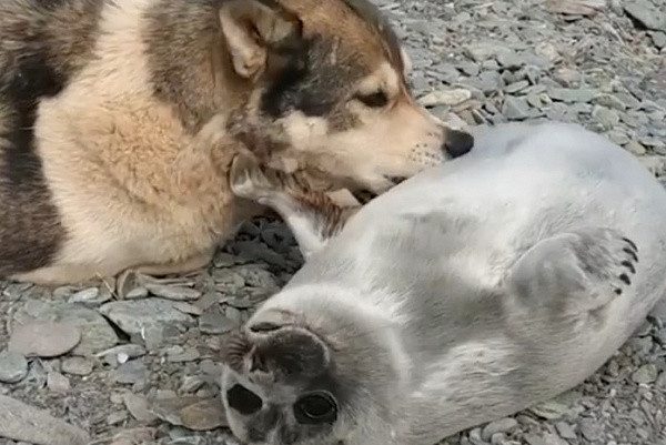 Собака выходила детёныша нерпы, которого нашли на берегу озера