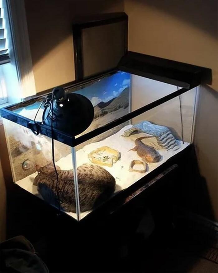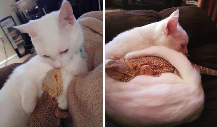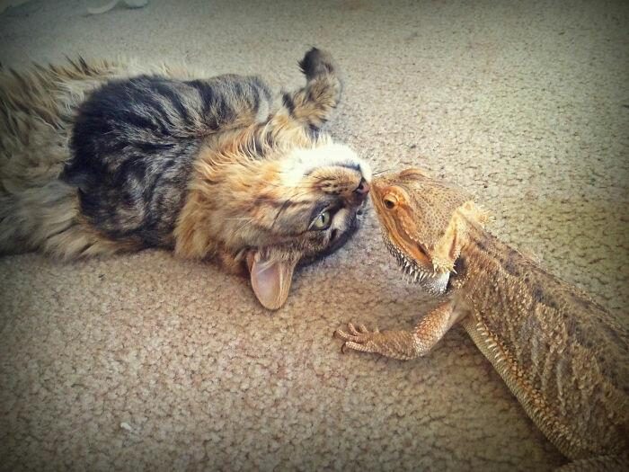«Моя кошка приняла спасённую ящерицу, которую я принёс домой. Они вместе дремлют и шпионят за соседями через окно»