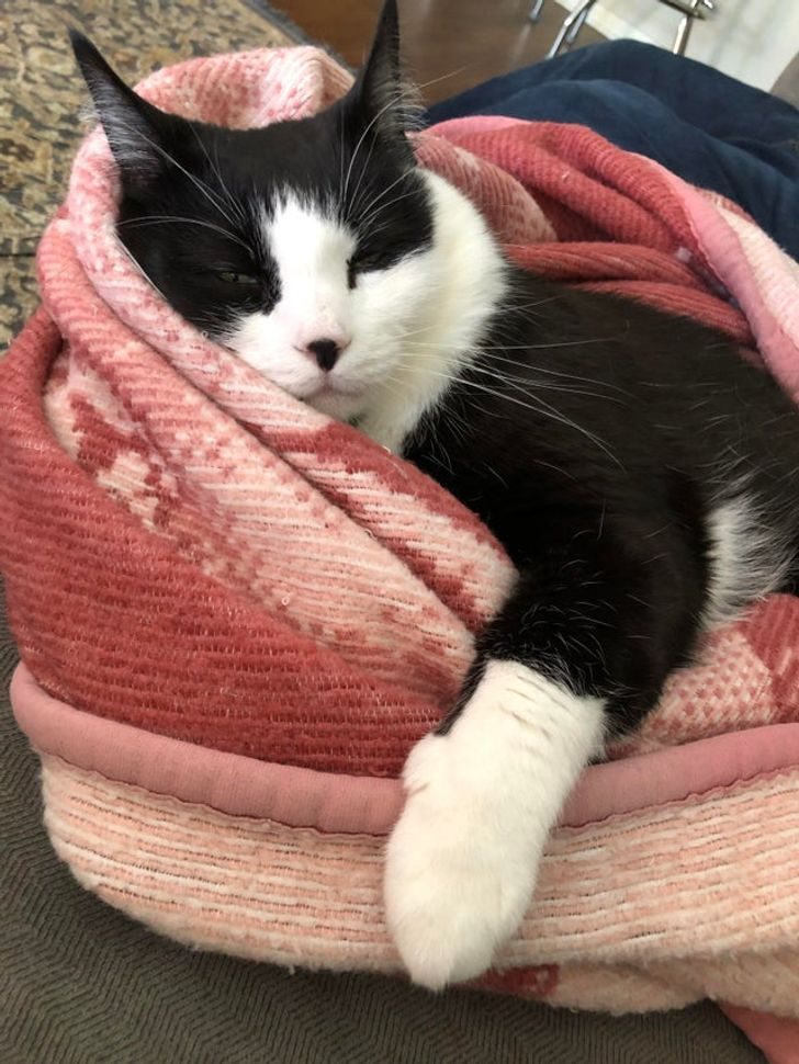«Гильермо требует, чтобы его завернули. Ему нравится, когда мы берем одеяло, скатываем его в трубу, сгибаем в форме подковы и затем обвиваем ей кота сзади, спереди и между лапок. Он сразу засыпает»
