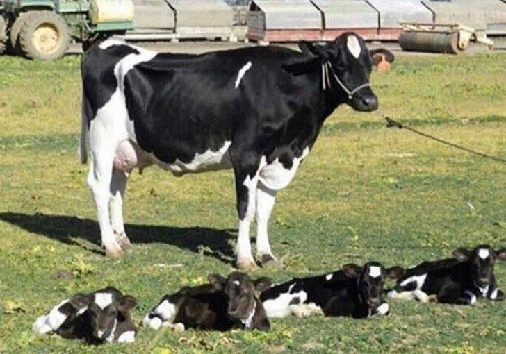 Четыре теленка за раз – это почти рекорд. Разумеется, все в маму, с белым пятном на лбу.