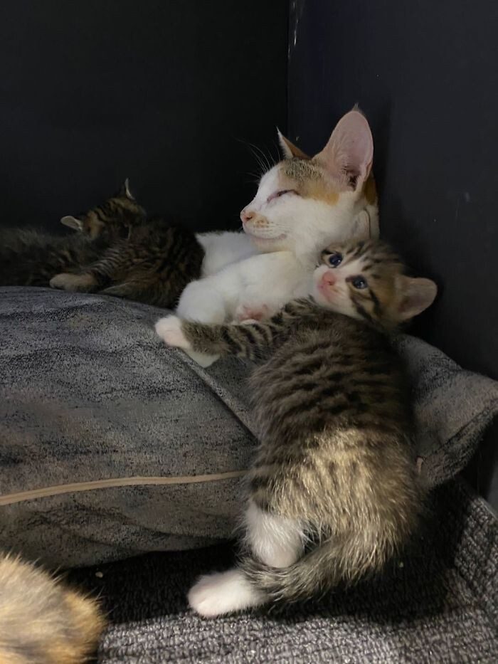 Когда котята подрастут, для них и их мамы Бобы найдут любящих хозяев, а пока — они счастливы вместе!
