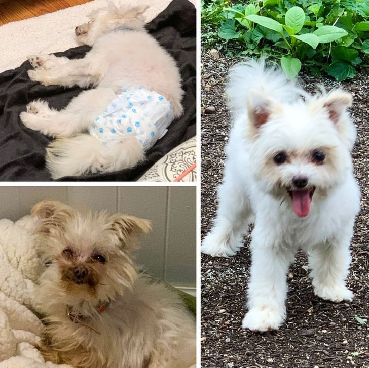 «Слева — до усыновления, справа — счастливый, здоровый щенок в своем доме!»
