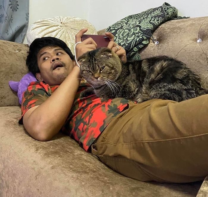 Выражение хитрой мордахи ни с чем не перепутаешь, котяра будто ехидно делает выпады в сторону жены Нашрин. Мол, накося-выкуси, женщина, этот мужик теперь мой! И ничего с этим не поделать. На самом деле Джарвис одинаков ласковый со всеми, включая гостей, это вообще уникально дружелюбный кот, который живет в семье уже шестой год. И к жене он также ластиться, но ленивый муж не считает нужным фотографировать эти нежности. Малость обидно.