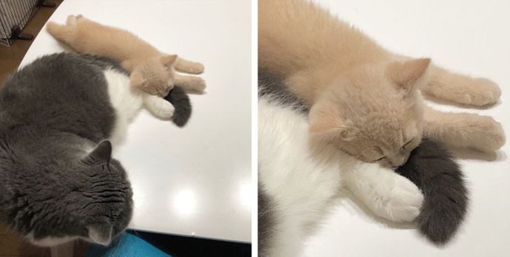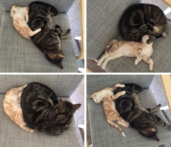 «Каждый раз, когда я заходил проверить, спят ли моя кошка и котенок вместе, позы становились все смешнее»