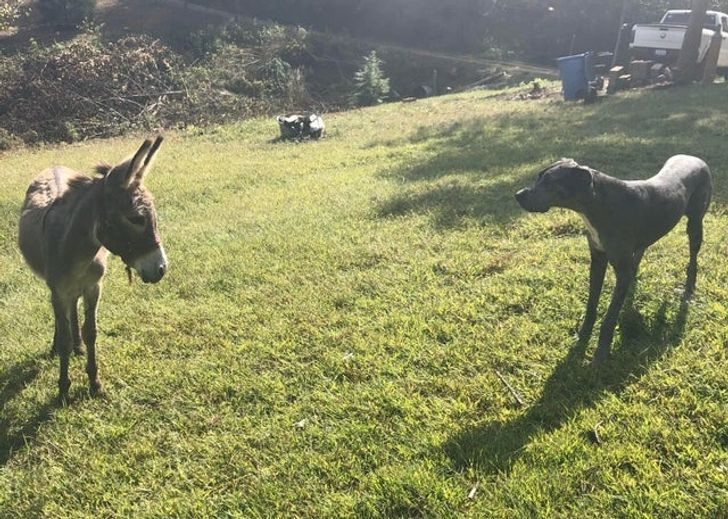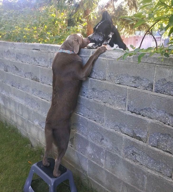 «Наконец-то сосед дал табурет своему псу, чтобы он мог как следует поприветствовать своего большого друга»