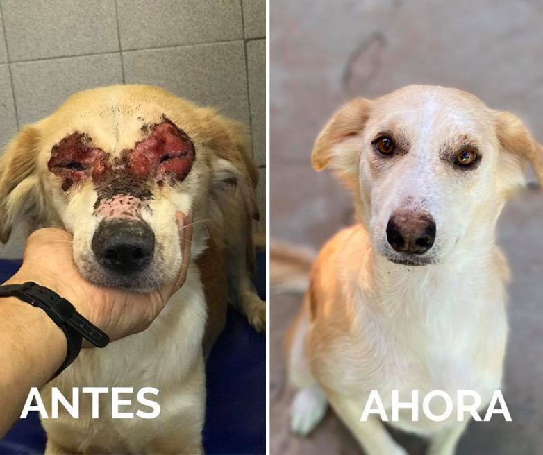 Похоже кто-то вылил на мордочку этой собаки что-то горячее, оставив сильнейший ожог. К счастью, ей помогли волонтёры и теперь эта красавица совершенно здорова