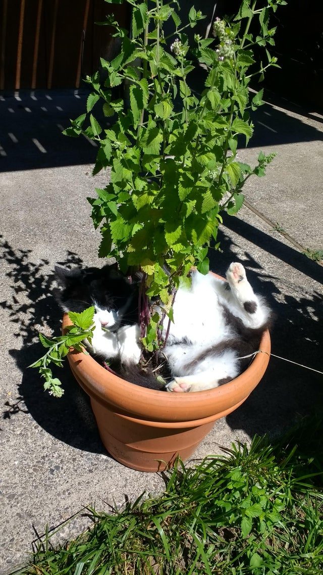 Поставили кадку с кошачьей мятой во дворе, кот балдеет