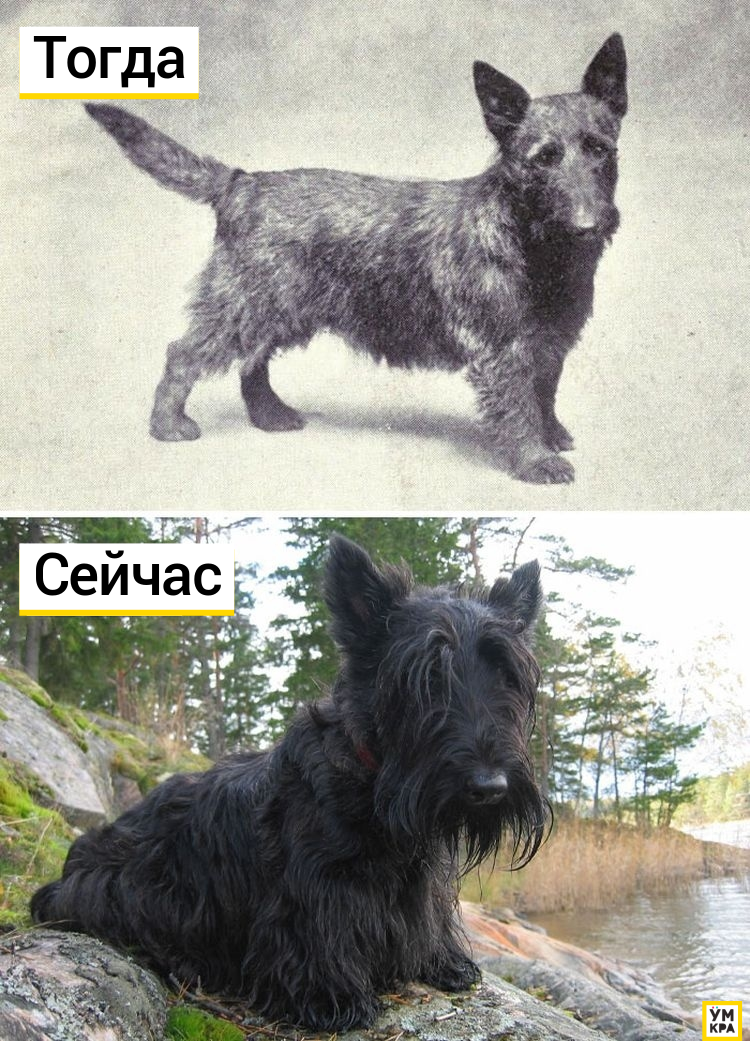 Шерсть шотландского терьера теперь намного длиннее, а также имеет немного другую текстуру, что делает ее более мягкой. 100 лет назад их шерсть была жесткой.