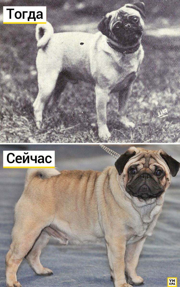 Эти милашки примерно того же размера, что и столетие назад, но у них были более крупные глаза и более плоские носы. К сожалению, это привело к проблемам дыхания, а также мопсы имеют другие проблемы со здоровьем, в числе которых специфическое заболевание глаз, называемое «хроническая эрозия роговицы».
