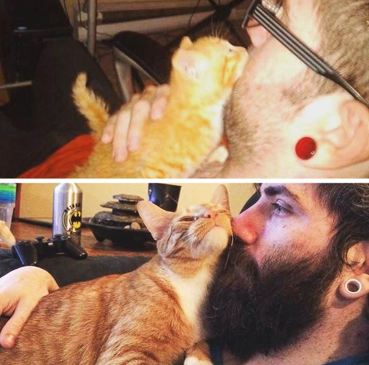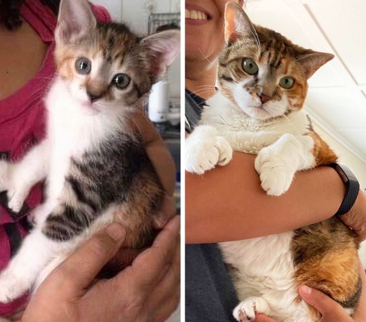 «Это моя кошка Цинчи через месяц после того, как появилась у нас. А на втором фото — 10 лет спустя. Она любит обниматься и всегда была фотогеничной»