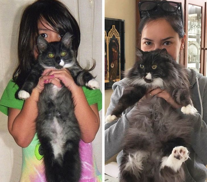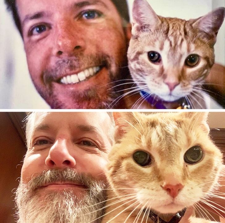 «Воссоздали фотографию с моим котом Чендлером Бингом. 13 лет прошло со времен фото слева»