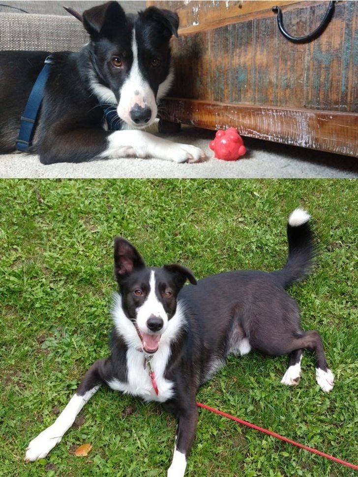 «Застенчивый парень, который потихоньку раскрывается. На фото он в первый день, неуверенный в том, что делать с мячом, и месяц спустя, наблюдающий, как я держу тот же мяч над камерой»