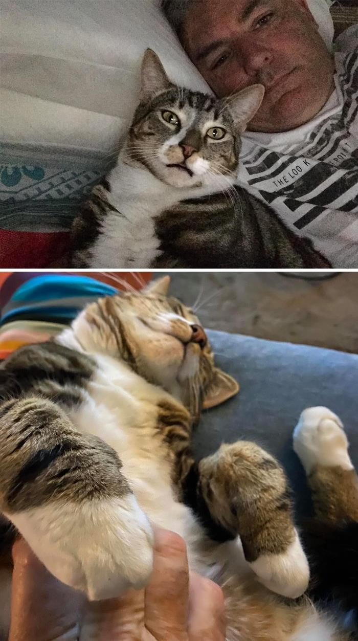 «Кто-то выбросил этого полосатого кота возле нашего дома, он спрятался под машиной и очень громко мяукал. Я вышел, встал на четвереньки и мяукал в течение 30 минут. В конце концов он вышел и я его покормил. Мы с женой легли спать, думая, что он ушёл через кошачью дверь. 2 минуты спустя он был в нашей постели»