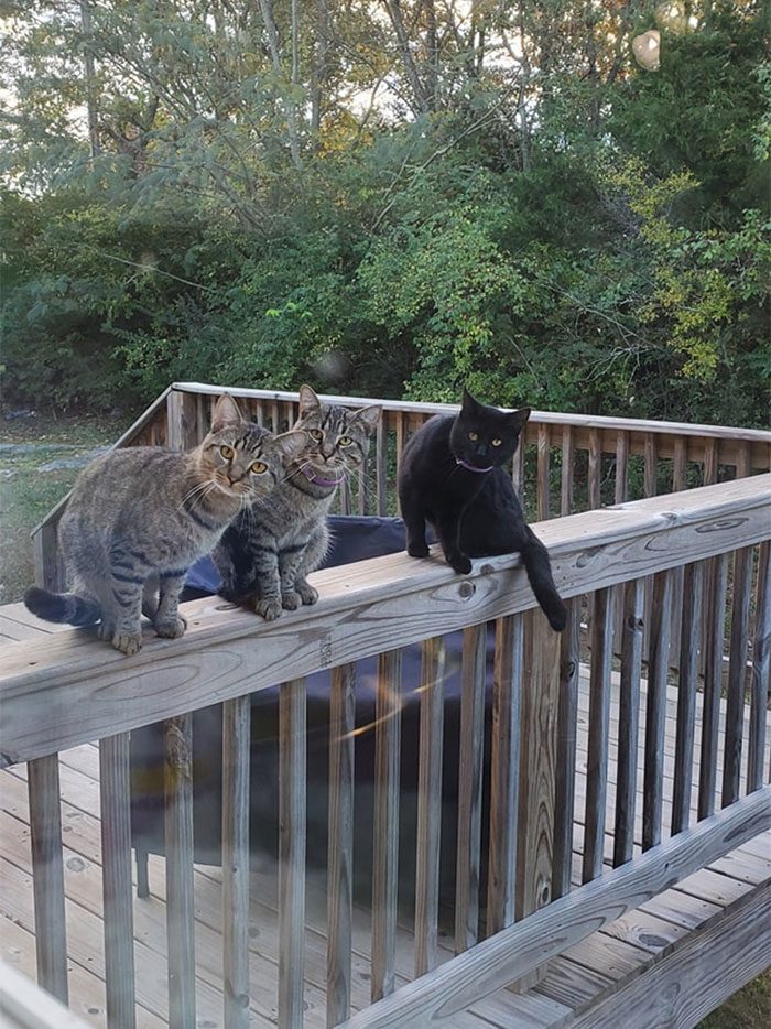 «Этим летом к нам во двор заглянула эта совсем юная особа. Ее посещения стали происходить ежедневно. Потом она родила под нашим крыльцом 4 котят. Вскоре она перетащила их в наш гараж. Затем она начала выносить их на крыльцо… затем в кухню… потом я проснулся и увидел, что все они тут. Я не думаю, что они собираются уходить»