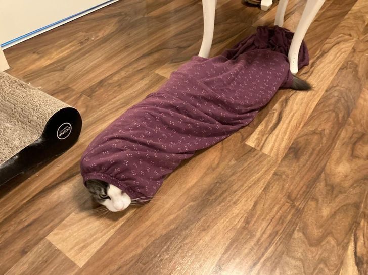 Стащить штаны от пижамы, залезть внутрь и застрять там. Вот она, цель кошачья!