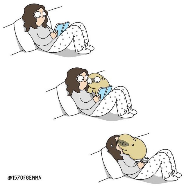 И хотя некоторые её комиксы не изобилуют диалогами, они говорят сами за себя: о том, каково жить вместе с собаками, с чего начинается утро владельца собаки и какое это удовольствие, когда дома тебя ждёт пушистый комочек. Три!