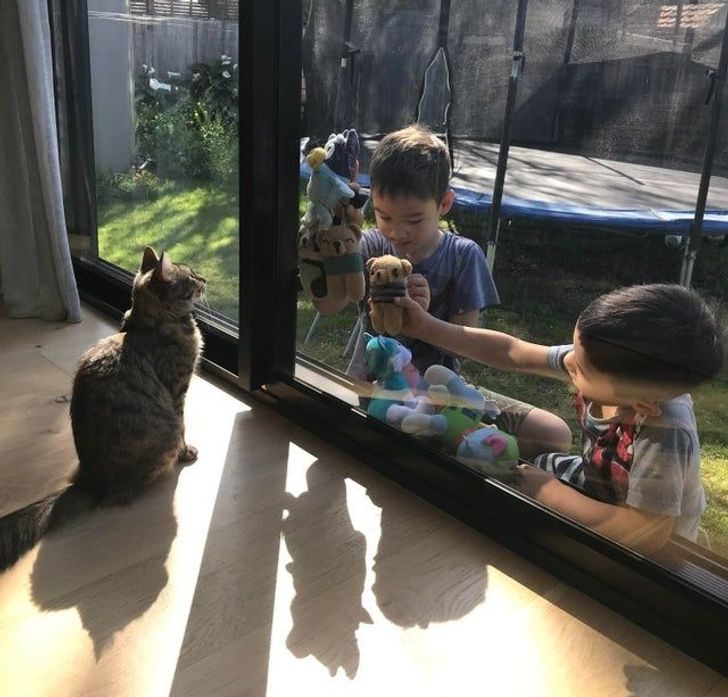 Дети заметили, что кошка любит наблюдать у окна, и решили показать ей кукольное представление