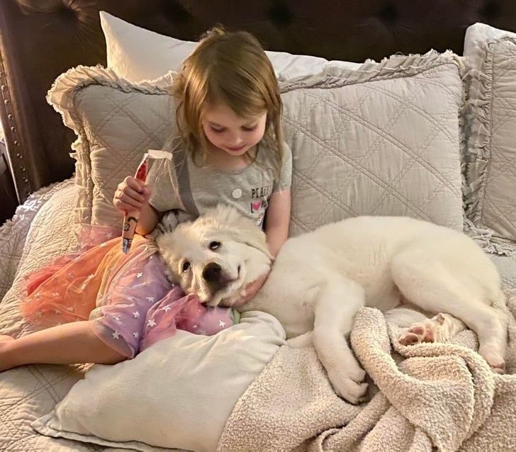Этой собаке сделали недавно операцию и девочка развлекает её, читая вслух
