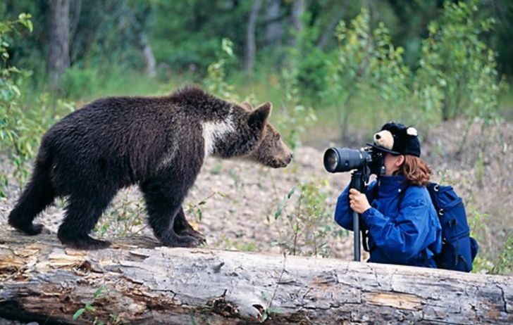 Непонятно, что больше привлекло этого медвежонка гризли: фотоаппарат или шапка фотографа