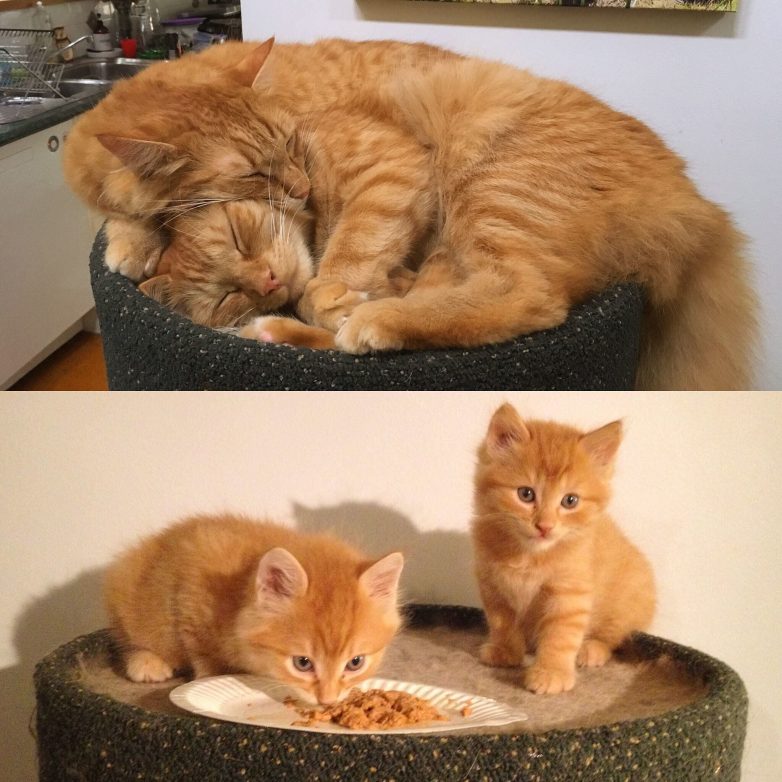 Два котенка одной семьи, черно-белый Паша и рыжий Симба. Фото с первого знакомства и сейчас.