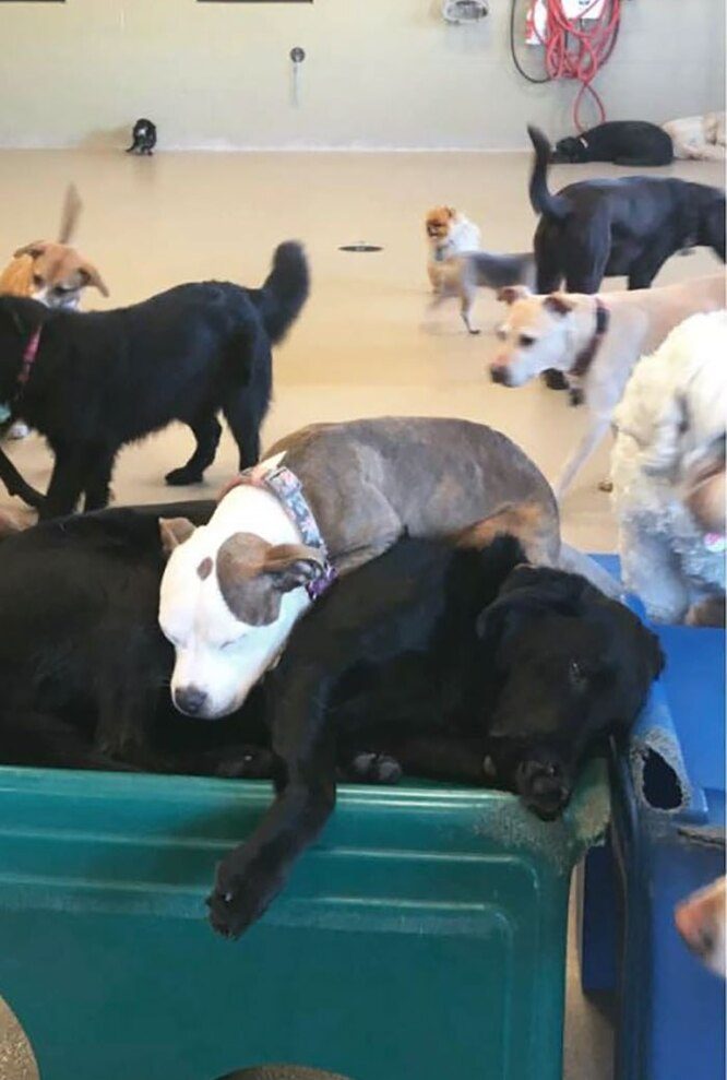 Эдна ходит в детский сад для собак с раннего детства. Первые два-три часа она всегда активно бегает и прыгает с другими питомцами, а затем, когда запас энергии у нее подходит к концу, начинает искать уютное место для сна — и в большинстве случаев им становятся большие пушистые собаки.