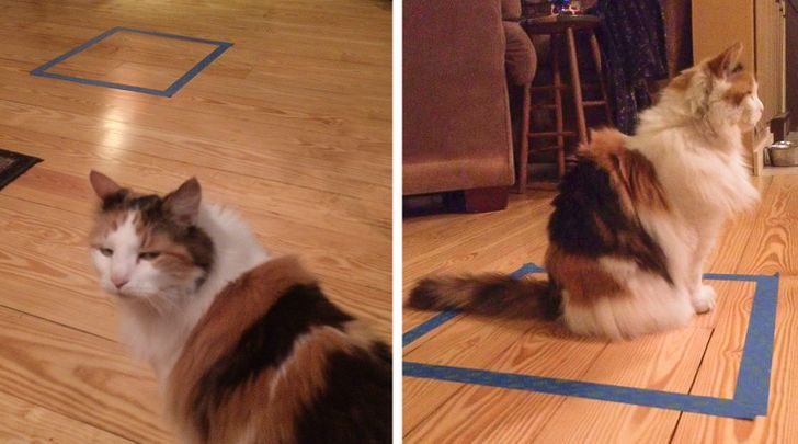 Только мы немного разобрались с коробками, как пушистые решили подкинуть ученым еще одну задачу. Речь о кошачьем стремлении занять какое-то пространство прямоугольной формы, будь то сложенное полотенце, газета или, к ужасу хозяина, клавиатура компьютера. Более того, если соорудить на полу квадрат из цветной ленты, вероятнее всего, кот решит вместить себя в его пределы. Специалисты предполагают, что притязания питомцев на любые компактные площадки прямоугольной формы — это также стремление к защищенному размещению. Такой квадрат в восприятии кошачьих является все той же коробкой, только уже воображаемой.