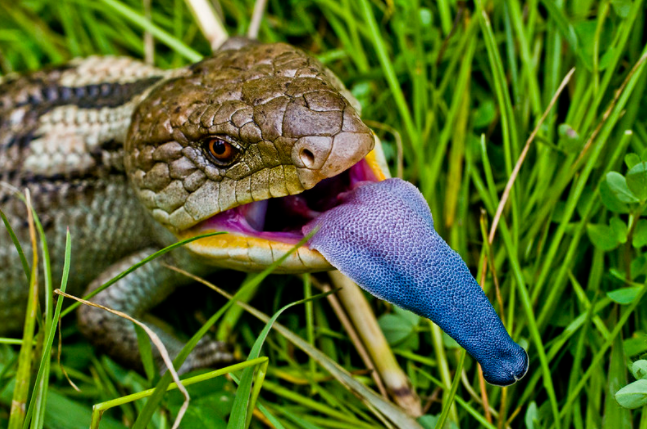 При угрозе синеязыкий сцинк может шипеть и показывать язык, отпугивая потенциальных хищников