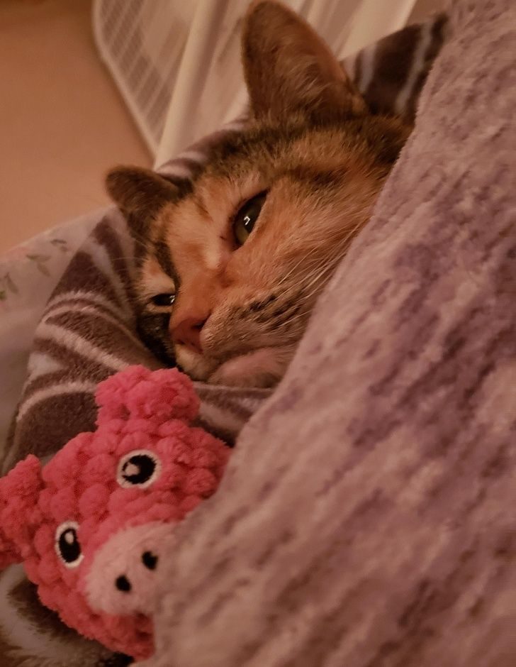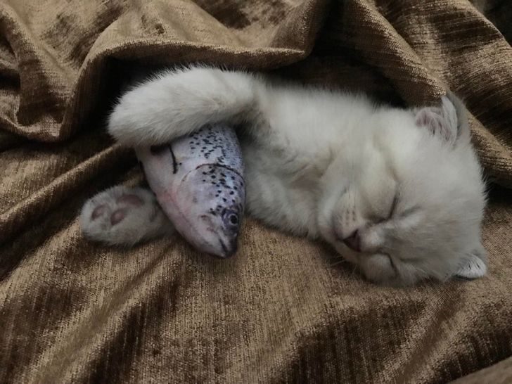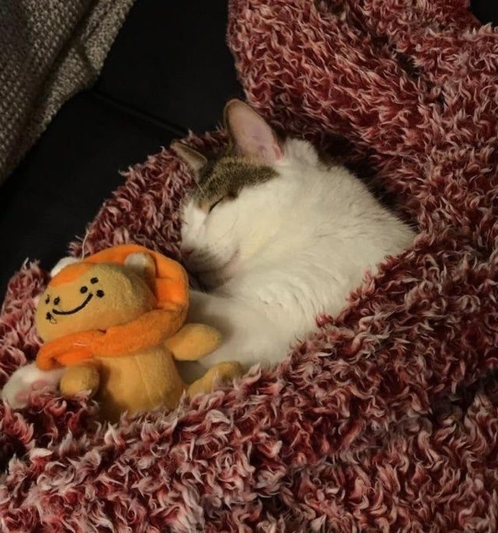 Кота укрыли и подложили игрушку, чтобы сделать милое фото, а он и не против