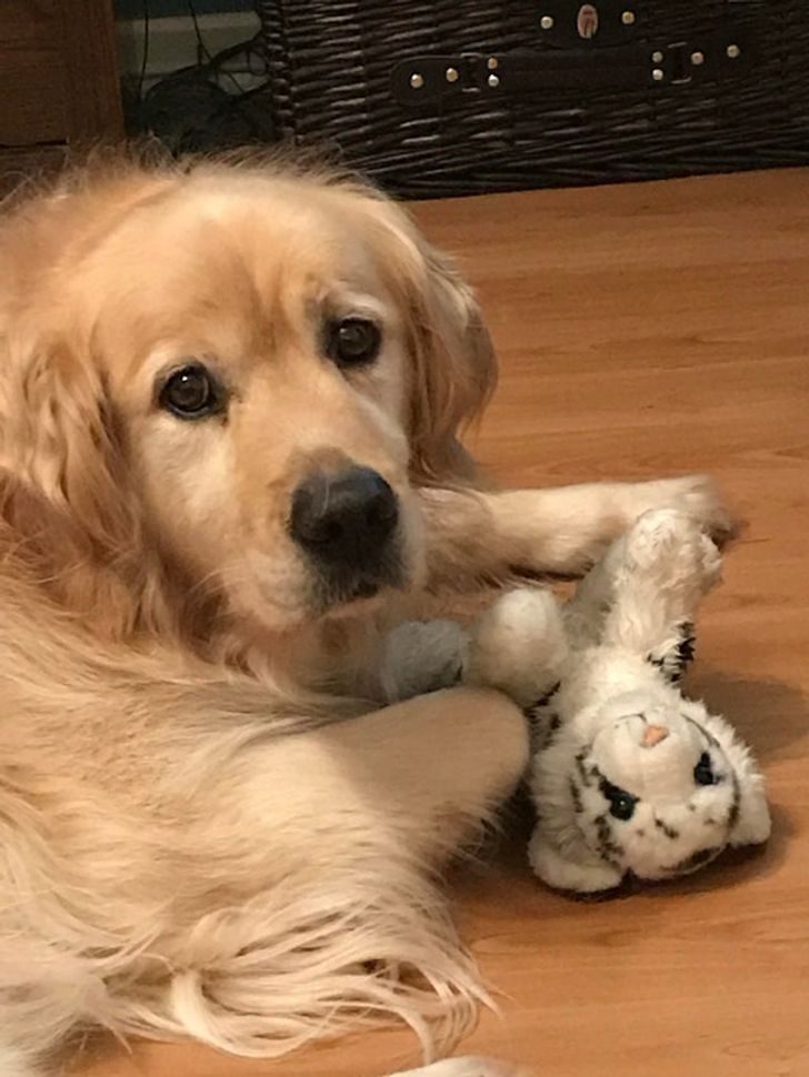 Большой и солидный пес, а любимую игрушку всегда держит возле себя
